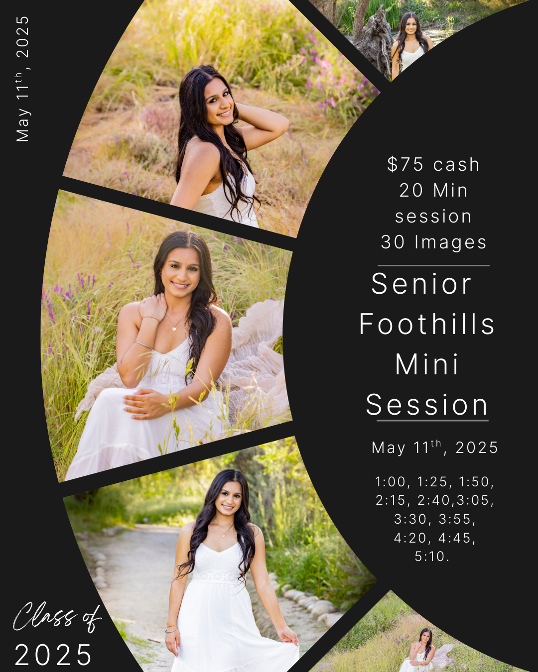 A mini session is a 15 minute outdoor studio portrait session where you get a set amount of images ( usually 5-10 images) for affordable rate. We takes a lot of photo’s in 15 min and you always have the option to purchase a custom engrave wood flash drive for a additional $35 and i will edit the rest the images and put them on the flash drive.